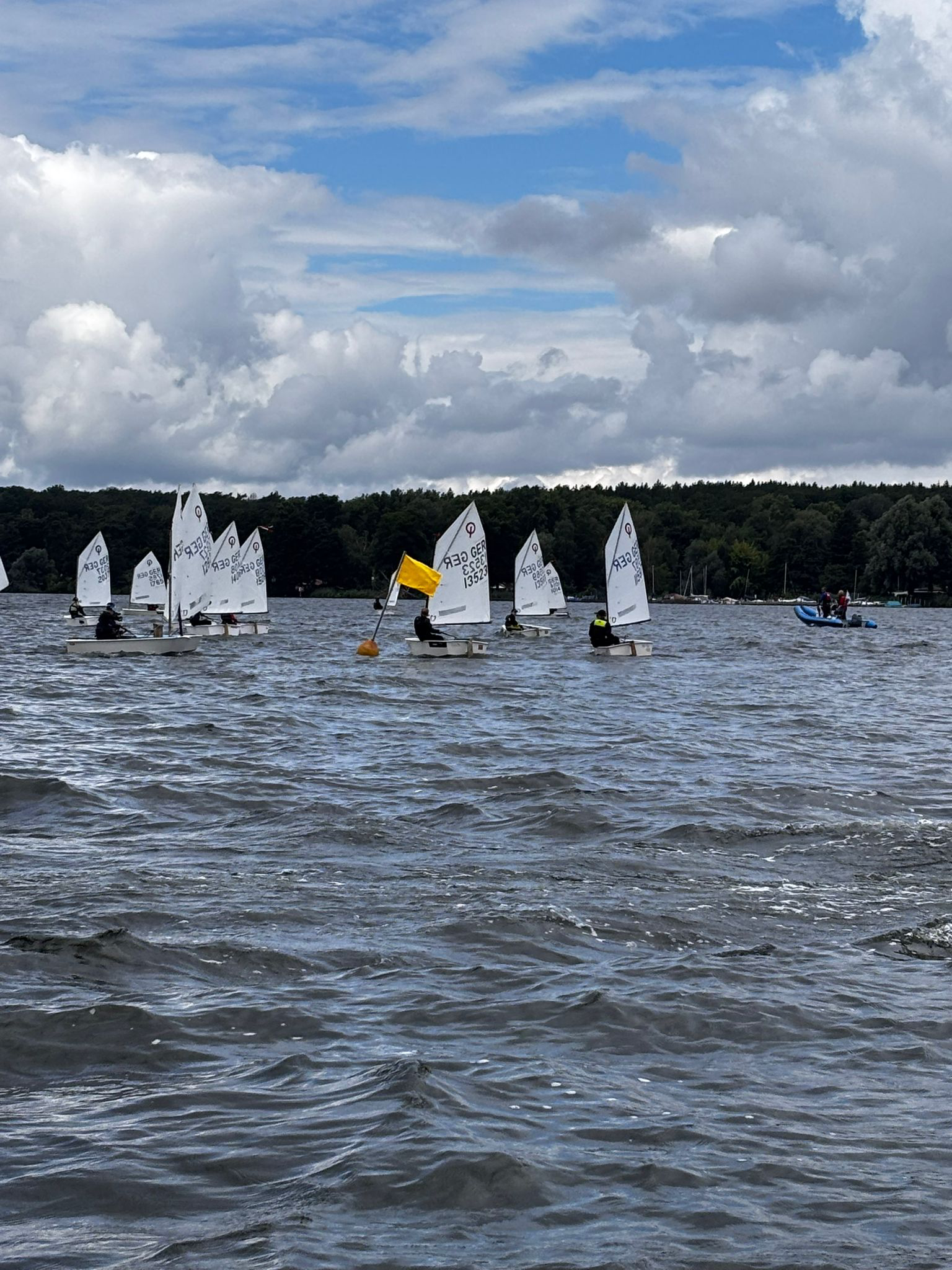 Am ersten Tag sind wir um 10 Uhr rausgefahren um um 11 Uhr zu starten. Es wehte ein schöner Wind mit etwa 10–11 Knoten. Wir konnten drei Wettfahrten segeln. Es hat dabei ziemlich viel geregnet, aber trotzdem war es richtig gut. Auf dem Rückweg kam noch etwas mehr Regen – aber das hat eigentlich nicht gestört, weil fast alle im Schlepp waren. Da spritzt sowieso alles voll, also hat man den Regen kaum gemerkt.
