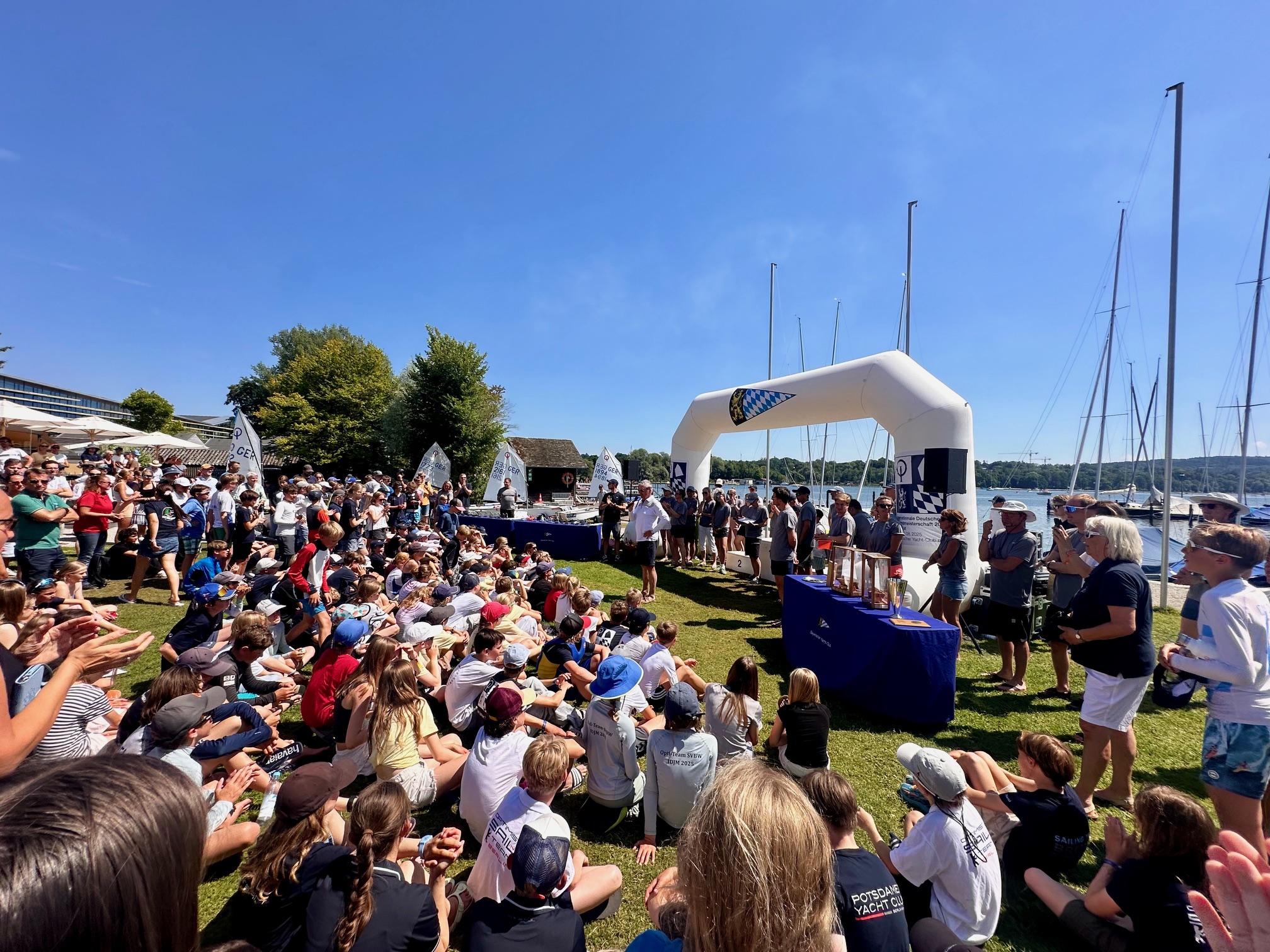 Die Siegerehrung wurde eingeläutet von einem Kunstflieger, der für uns das Opti-Zeichen in den Himmel malte. Dann ging es nach den Dankesworten des Vorstandes zu den Platzierungen. Der erste Preis ging für das beste Bundesland an: BERLIN! Also auch an uns – den PYC!