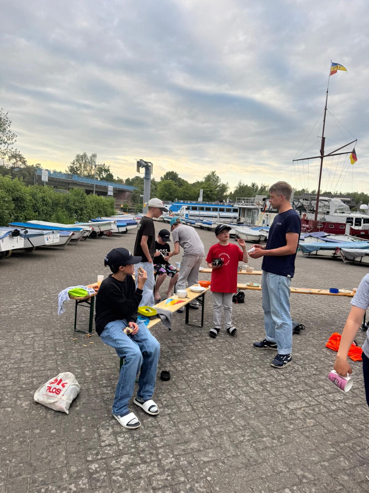 Am Donnerstag gab es ein schmackhaftes und umfangreiches Frühstücksbüffet (wie im Hotel - danke an Christine!!) und gestärkt wurden wir rausgeschleppt. In Plau muss man immer erst einen idyllischen Kanal entlang geschleppt werden bevor man auf dem See ist. Bei wenig Wind haben wir trainiert und nach einer Mittagspause auf dem Wasser gab es ein Trainingsrennen mit den anderen Berliner Vereinen. Der Wind war dabei leider eher wenig. Im Gegensatz zu Freitag: da hatten wir teilweise richtig guten „Hängewind.“ Am Abend wurden Würstchen gegrillt und wir konnten Angeln, Fussball spielen oder mit ferngesteuerten Motorbooten im Hafen fahren. Einmal musste unser Trainer Sander ins Wasser springen, um unseren Fußball zu retten.